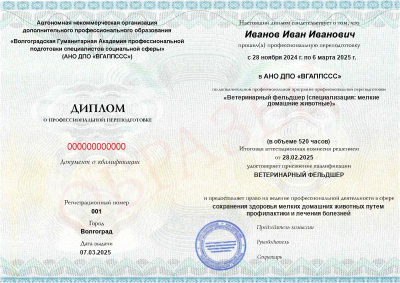 Обучение по такой программе – способ освоить новую профессию на основе ранее полученного образования. В дипломе выпускника указывается его ФИО, наименование учебной организации, название и длительность программы. Документ заверяется подписью руководителя и печатью АНО ДПО «ВГАППССС».