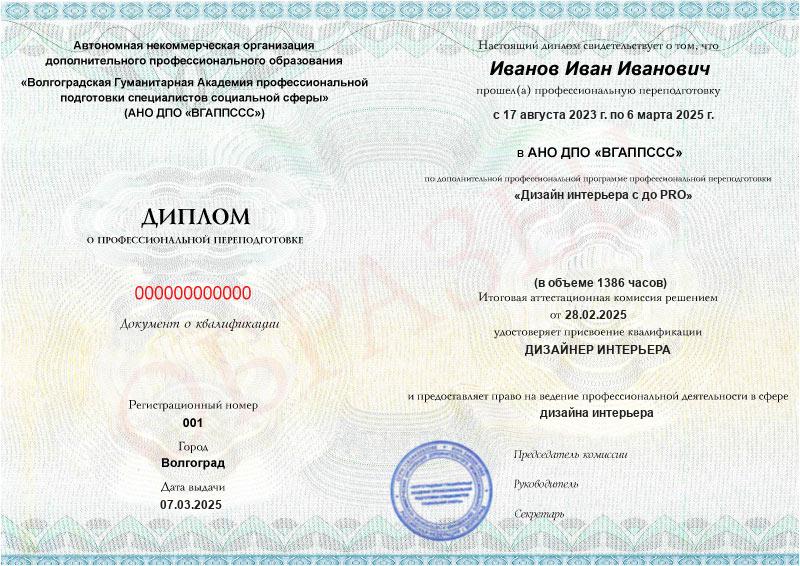Обучение по такой программе – способ освоить новую профессию на основе ранее полученного образования. В дипломе выпускника указывается его ФИО, наименование учебной организации, название и длительность программы. Документ заверяется подписью руководителя и печатью АНО ДПО «ВГАППССС».