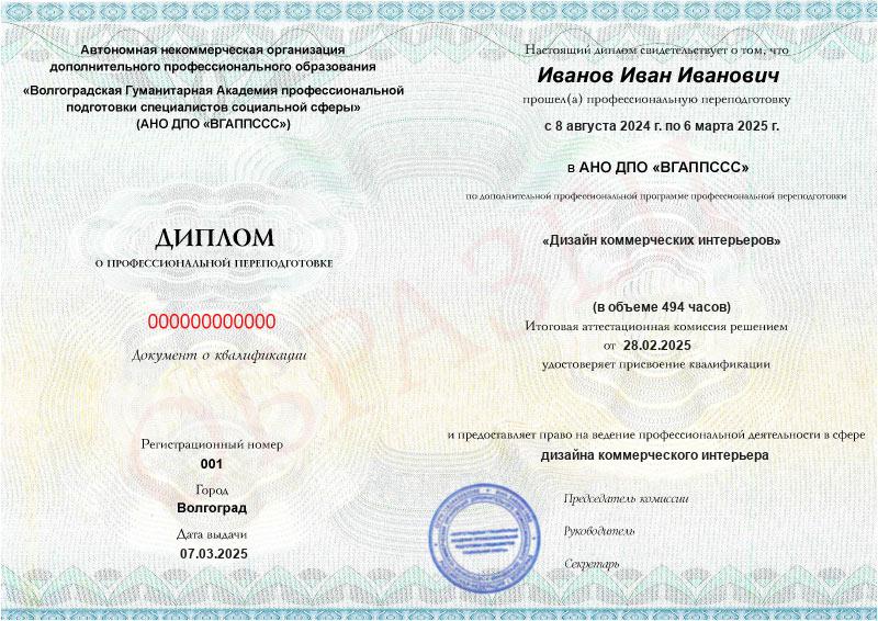 Обучение по такой программе – способ освоить новую профессию на основе ранее полученного образования. В дипломе выпускника указывается его ФИО, наименование учебной организации, название и длительность программы. Документ заверяется подписью руководителя и печатью АНО ДПО «ВГАППССС».