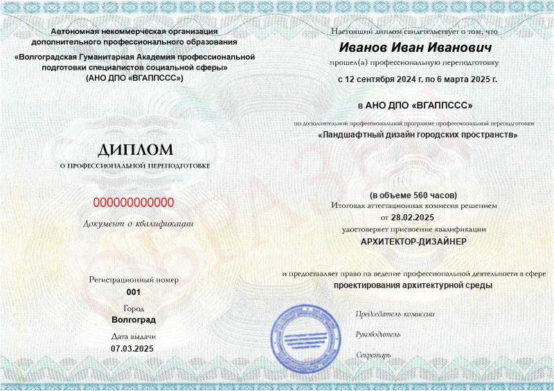 Обучение по такой программе – способ освоить новую профессию на основе ранее полученного образования. В дипломе выпускника указывается его ФИО, наименование учебной организации, название и длительность программы. Документ заверяется подписью руководителя и печатью АНО ДПО «ВГАППССС».